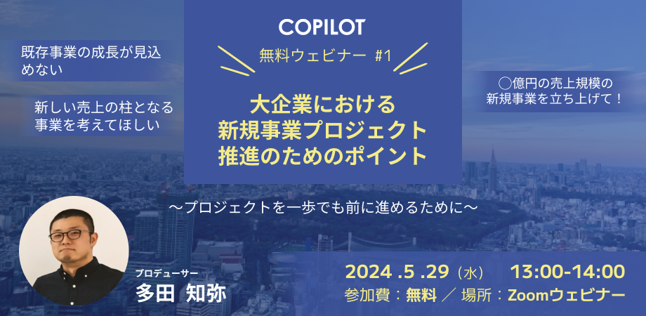 5月29日(水)開催のウェビナー『大企業における新規事業プロジェクト推進のためのポイント』では、大手日用品メーカー・大手住設機器メーカー等の新規事業の伴走支援を行ってきたコパイロツトの多田が、実際の経験から得られた”新規事業プロジェクト推進のためのポイント”を解説します。